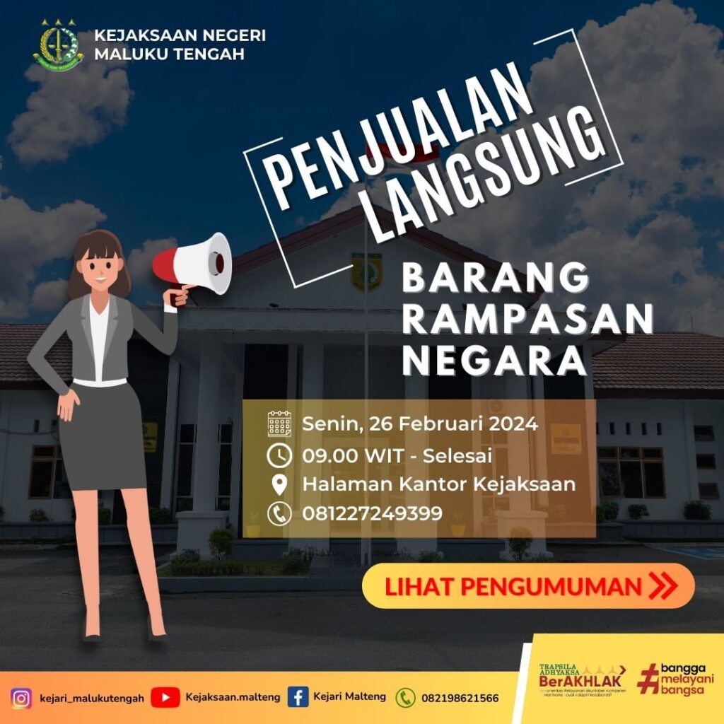 Kejaksaan Negeri Maluku Tengah akan melaksanakan Penjualan Langsung Barang Rampasan Negara sebagai berikut : No Nama Barang Unit Nilai Limit 1 BBM jenis solar yang ditampung dalam satu drum plastic biru 100 liter Rp. 680.000 Pelaksanaan Penjualan LangsungWaktu Penjualan : Senin, 26 Februari 2024 Pukul : 09.00 WIT – Selesai.Tempat Penjualan : Kantor Kejaksaan Negeri […]